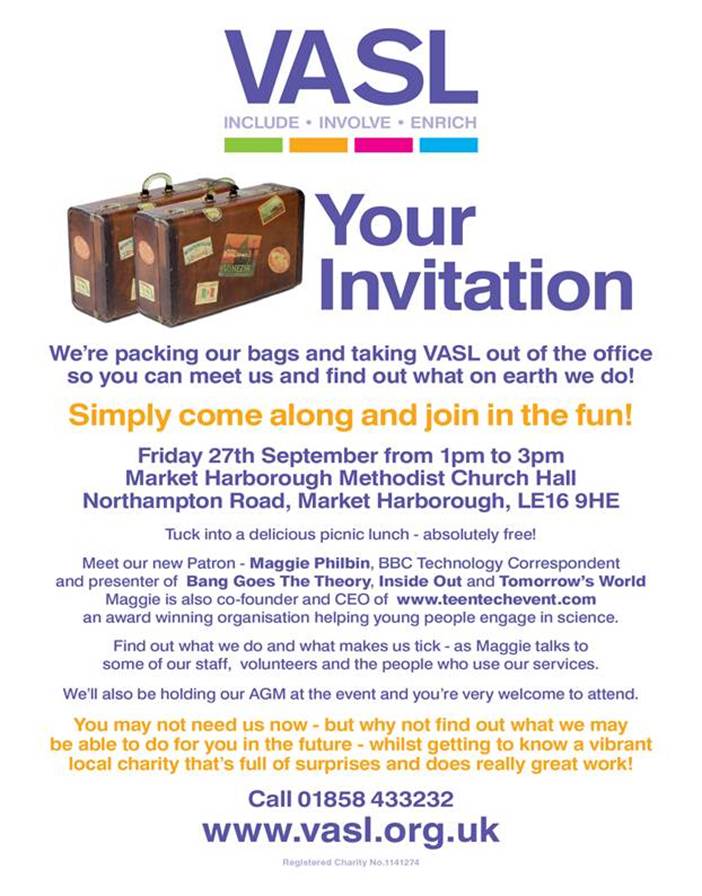If you live in Market Harborough and you'd like to pop in to find out more, VASL is based in The Settling Rooms, St Mary's Place (near Sainsbury's).